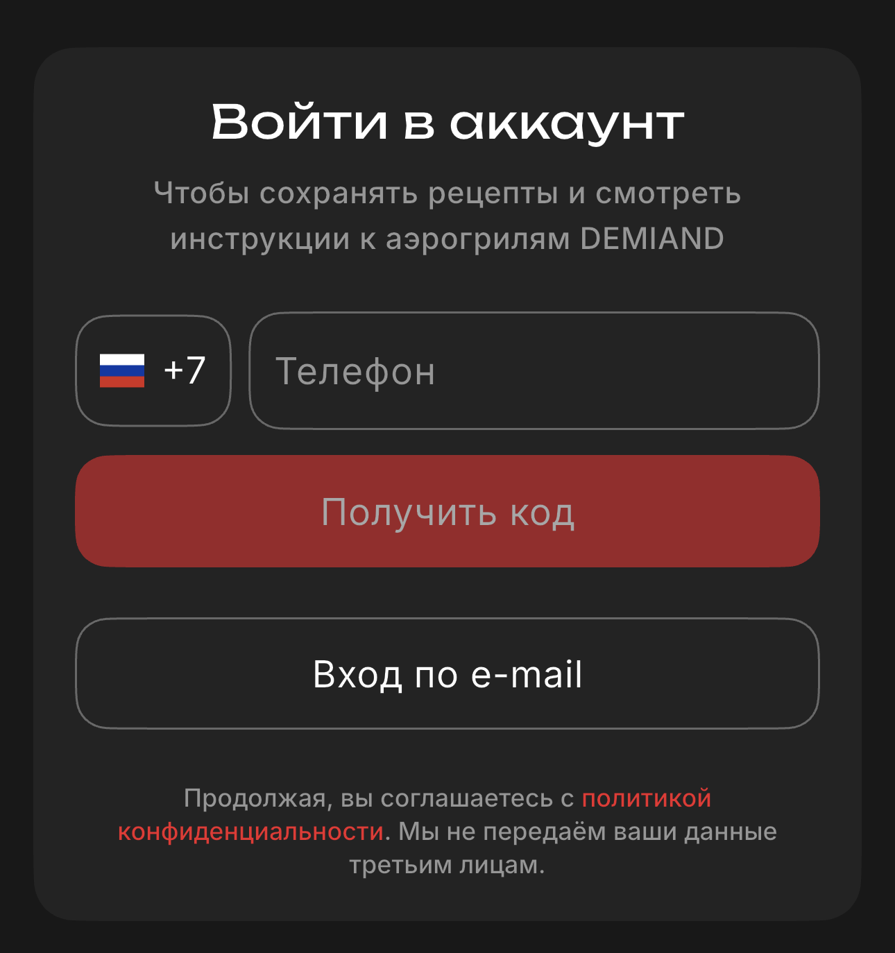 Вход по телефону сейчас работает только с российским номером